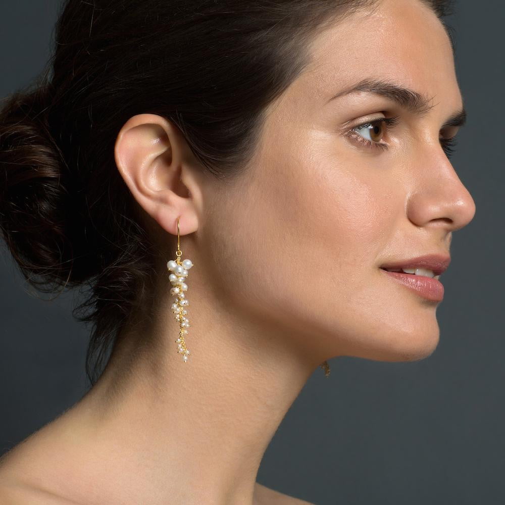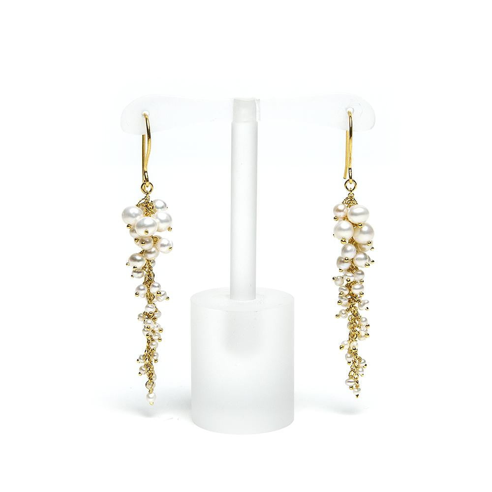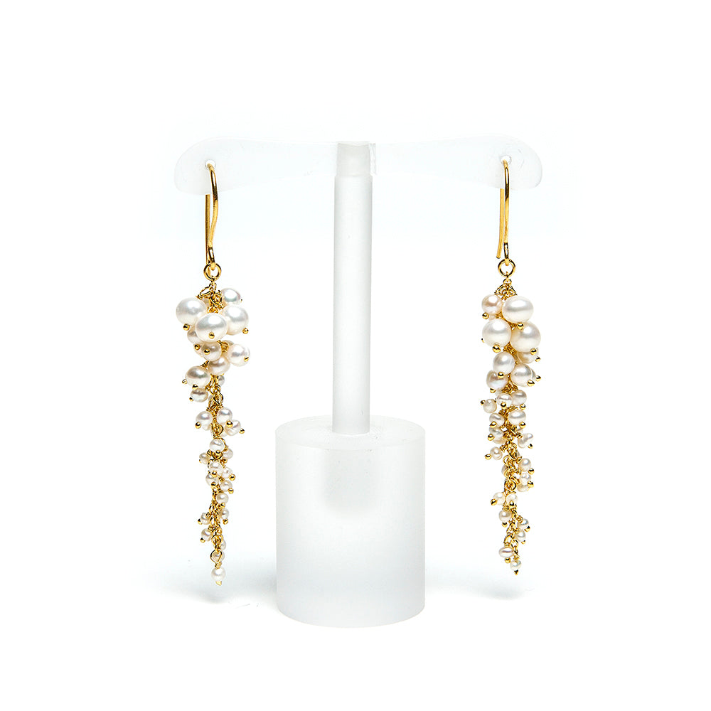 Long delicate freshwater graduated pearl earrings are the last word in elegance. On gold ear wires, they are clusters of fine pearls that cascade to a delicate tip.