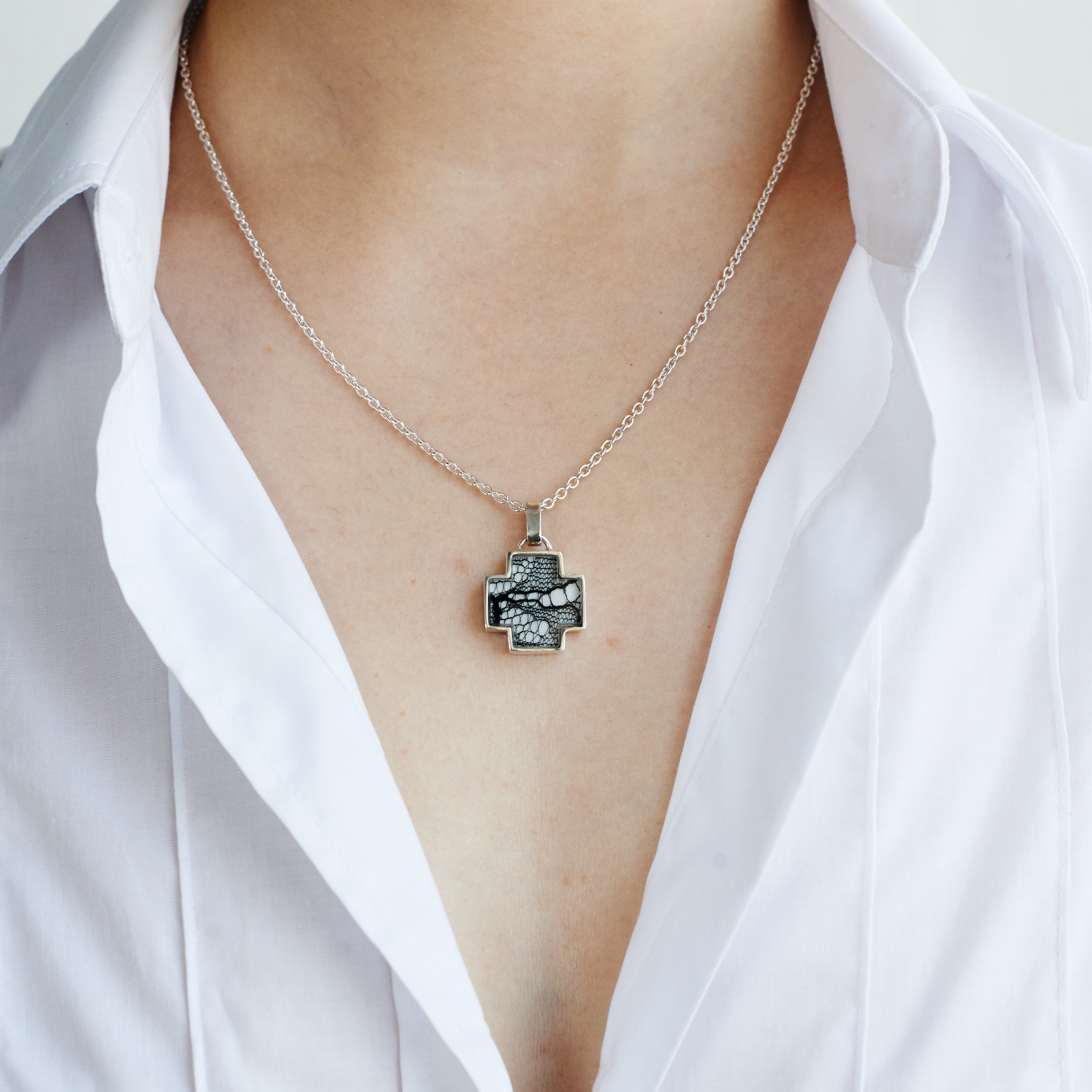 This beautiful lace in silver cross necklace makes a perfect 8th wedding anniversary as lace is the modern symbol for this celebration. The black couture lace and hallmarked sterling silver combine to make this cross-shaped pendant on a silver chain a thoroughly original piece.