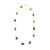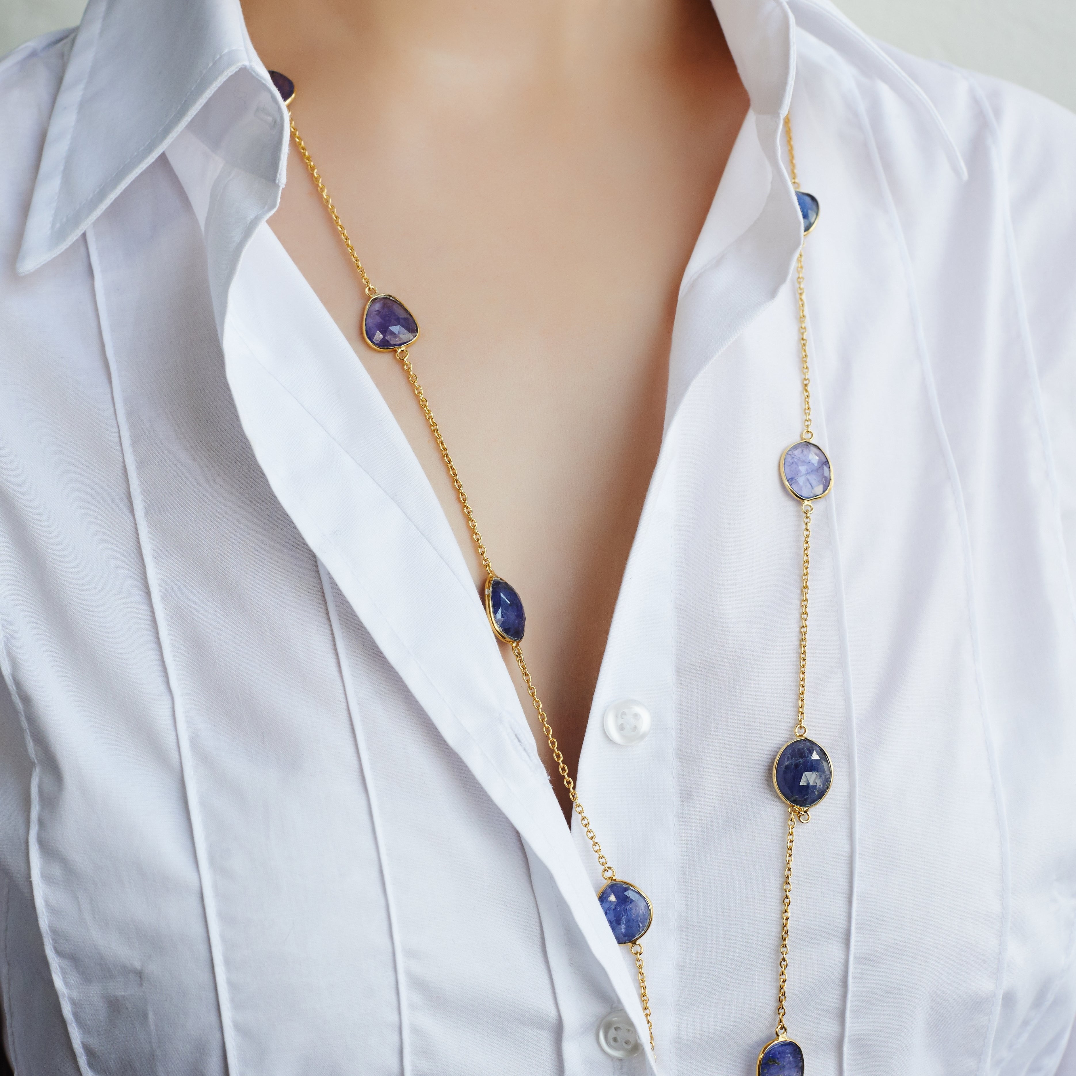 Violet blue tanzanite pebble-shaped stones provide beautiful highlights in this gold necklace. If you are looking for a gold gift for your first wedding anniversary this is an original idea while still on the theme. If she likes blue and elegant yet delicate jewellery, she will get wear out this as well as enjoyment. It has a clever fastener so it can be worn or short doubled as shown. Very versatile.