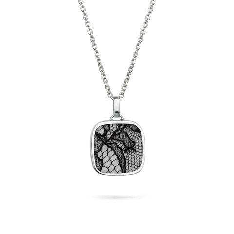 8th Wedding Anniversary Small Square Black Lace Silver Pendant Necklace