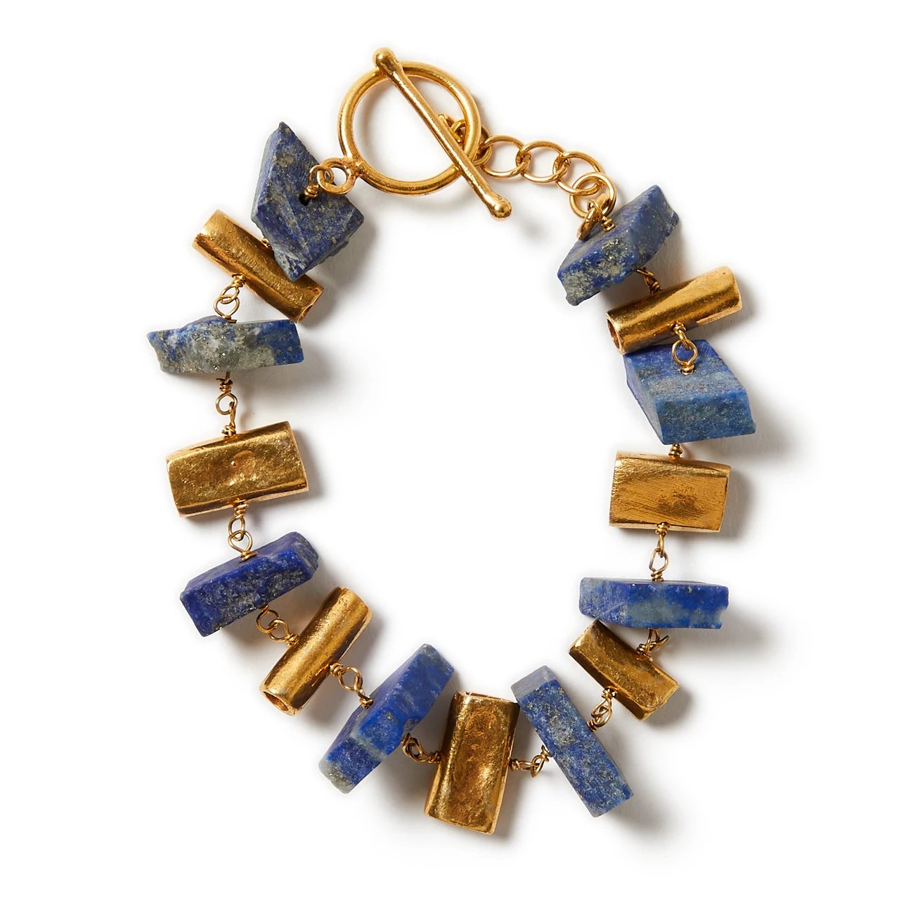 This raw unpolished blue lapis lazuli stone and gold tube bracelet has an elemental quality about it. If you love something original and earthy to wear, we think this is it. Lots of stones and gold dress up everything from a tee shirt to a work suite in an instant.