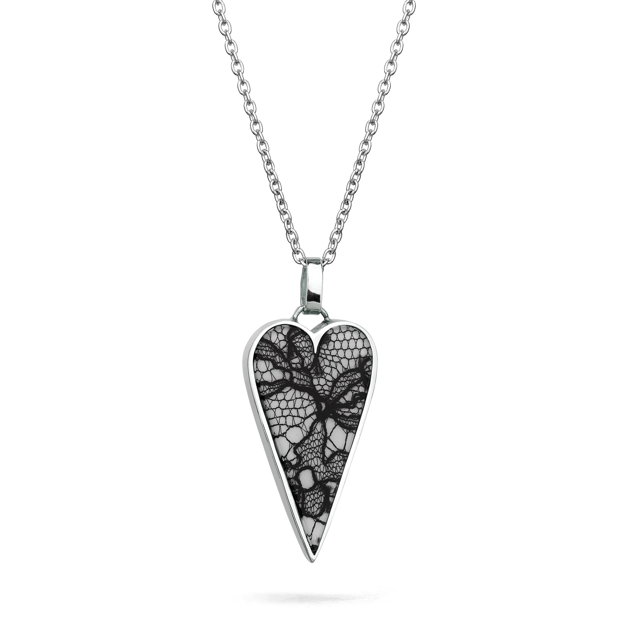 The super original combination of couture lace hallmarked sterling silver, and shape makes this heart pendant on silver chain thoroughly unique.