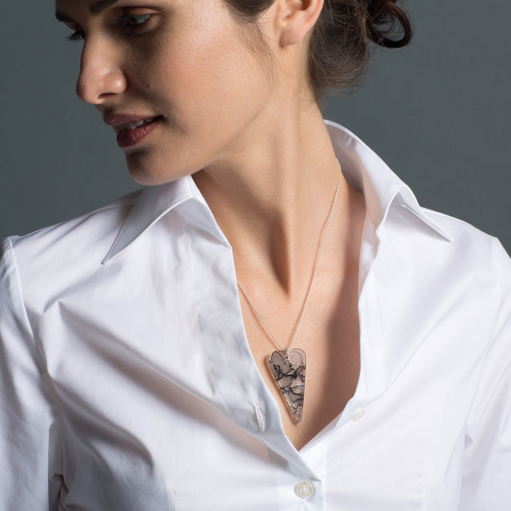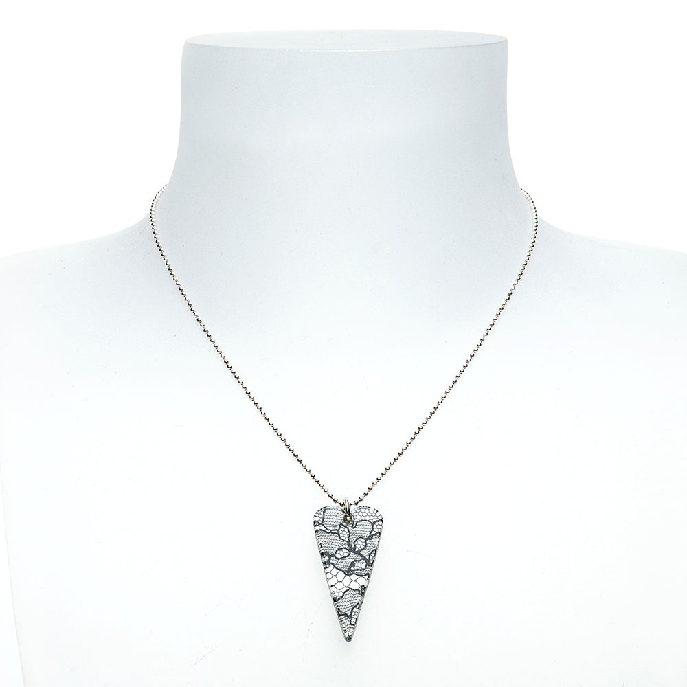 A modern take on the traditional heart. Made using black couture fine lace embedded in resin, this contemporary heart-shaped pendant on sterling silver ball chain smartens up a work shirt, and go with casual and evening wear.