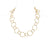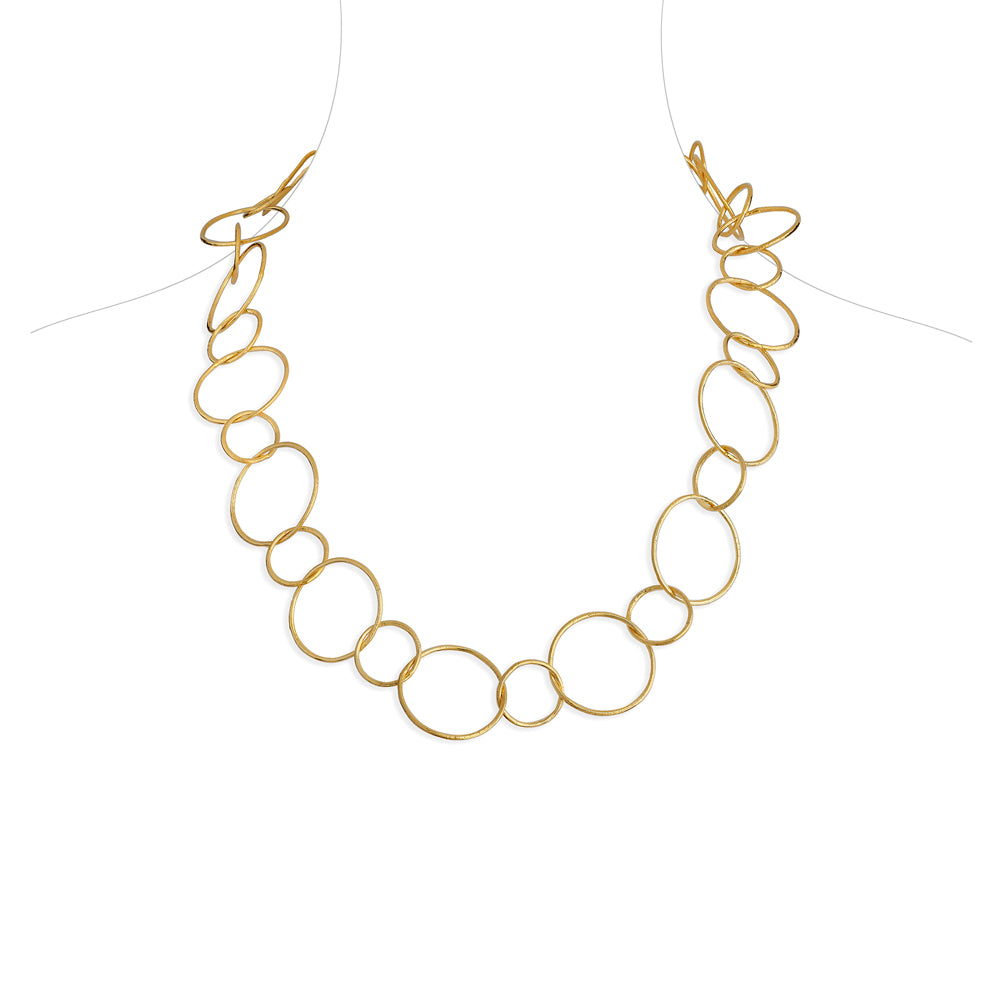 This a beautiful, textured gold hoop chain, ideal for wearing as it is here, with an open-necked shirt or plain coloured material. The open-chain work on this necklace makes it a show stopper and takes it beyond a mere chain. It is fastened with a lobster clasp at the back for extra security. We have long and short versions.