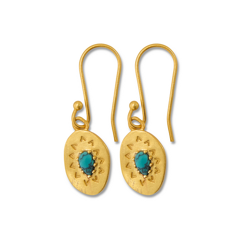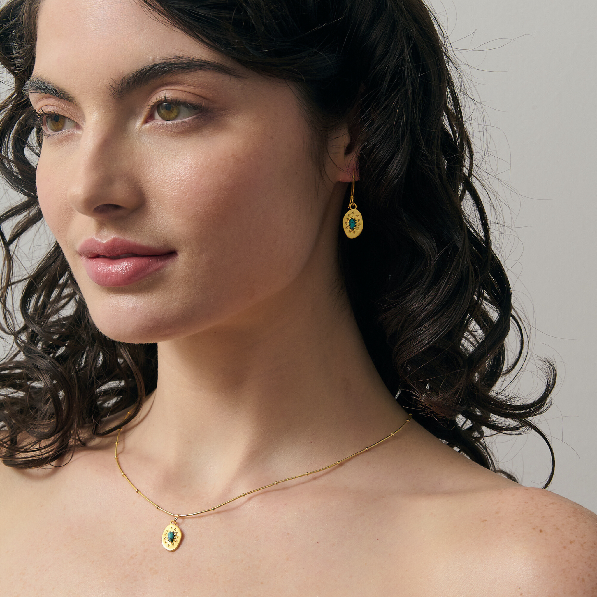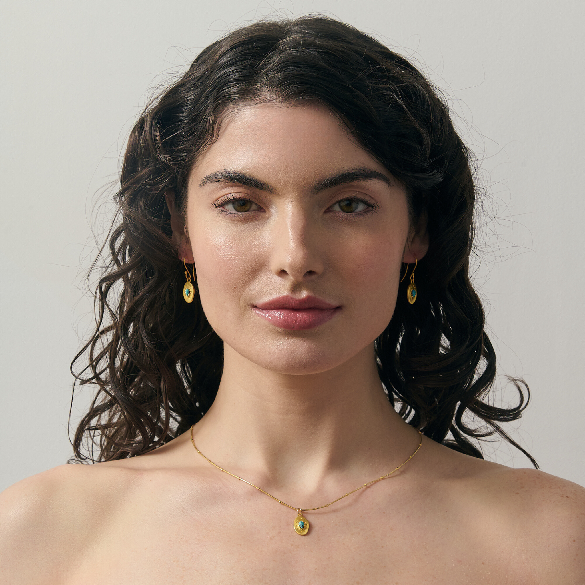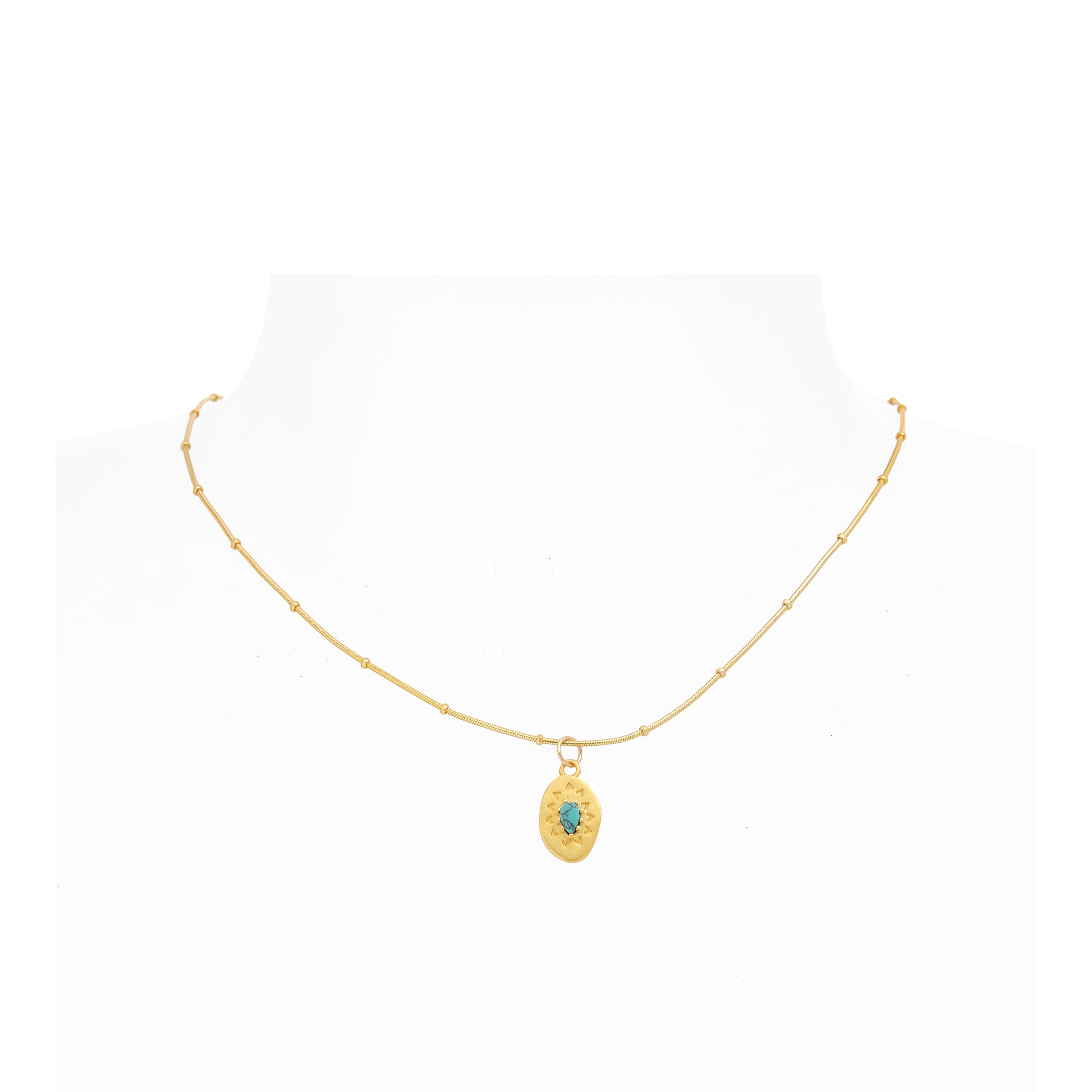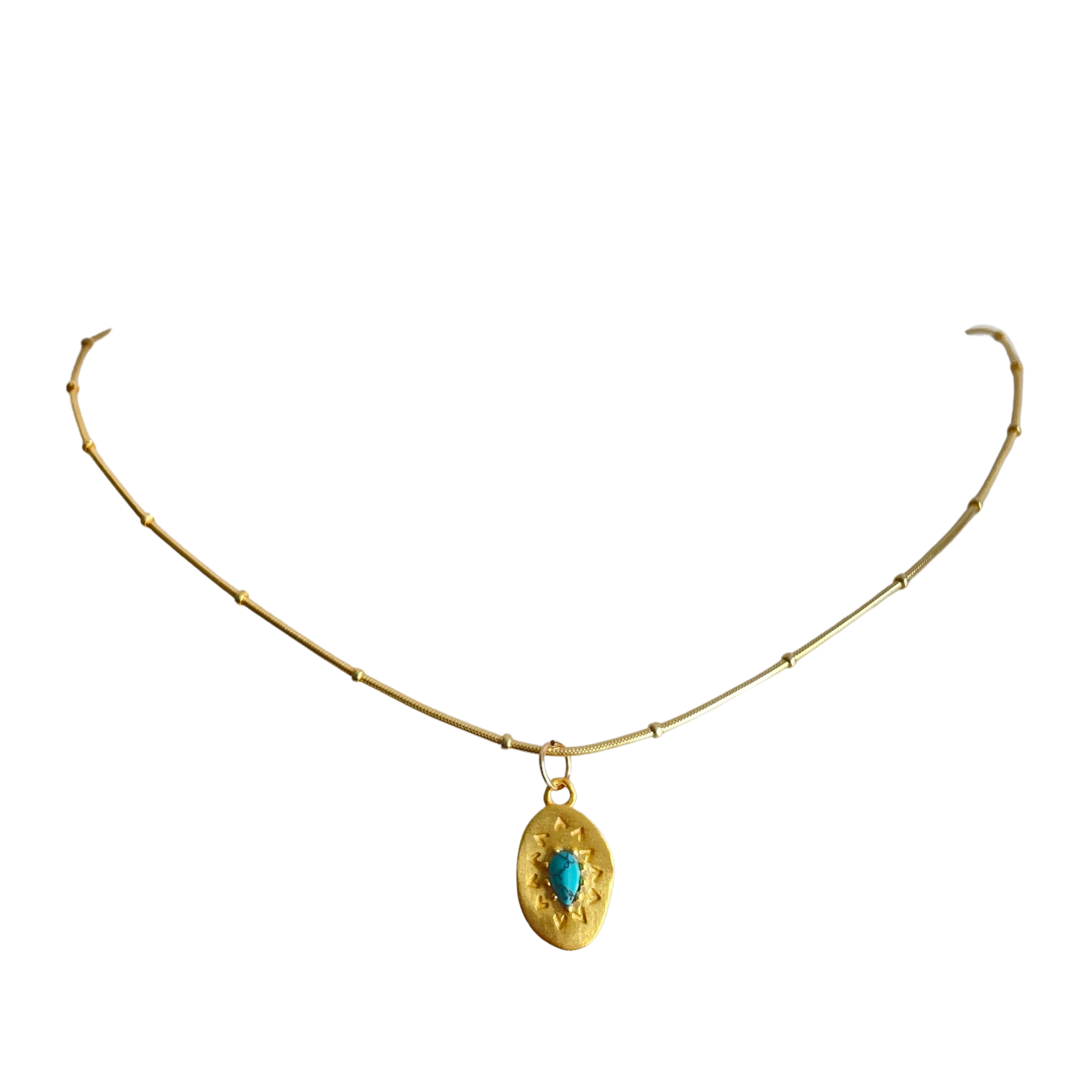 This delicate turquoise and gold artisanal necklace makes a great focal point for any outfit. Use it with layered gold chains or on its own with a bare neckline. Perfect jewellery if you are looking for your own personal talisman - or as a meaningful gift for someone special. Turquoise is said to enhance intuition and to help creative problem solving